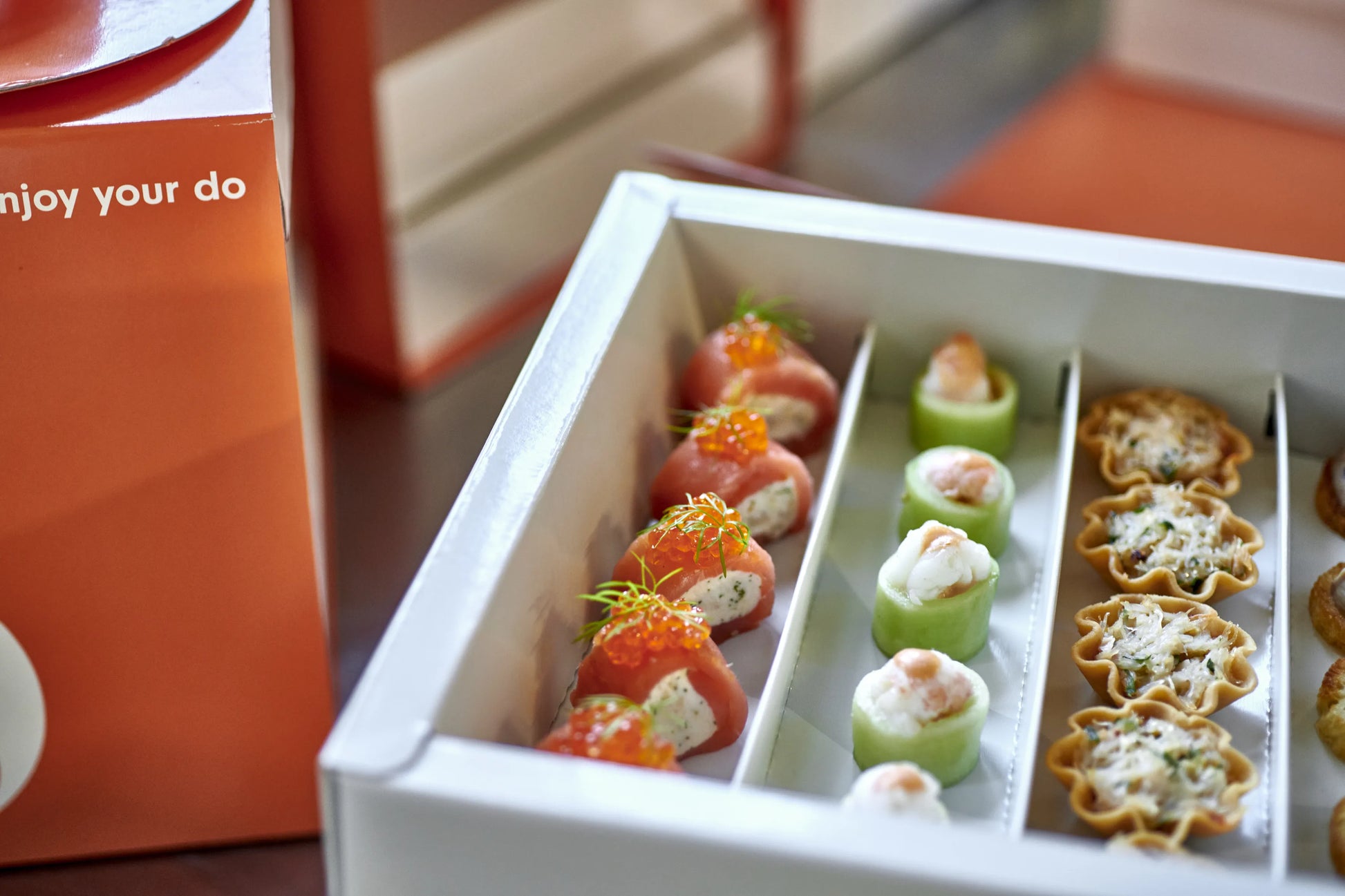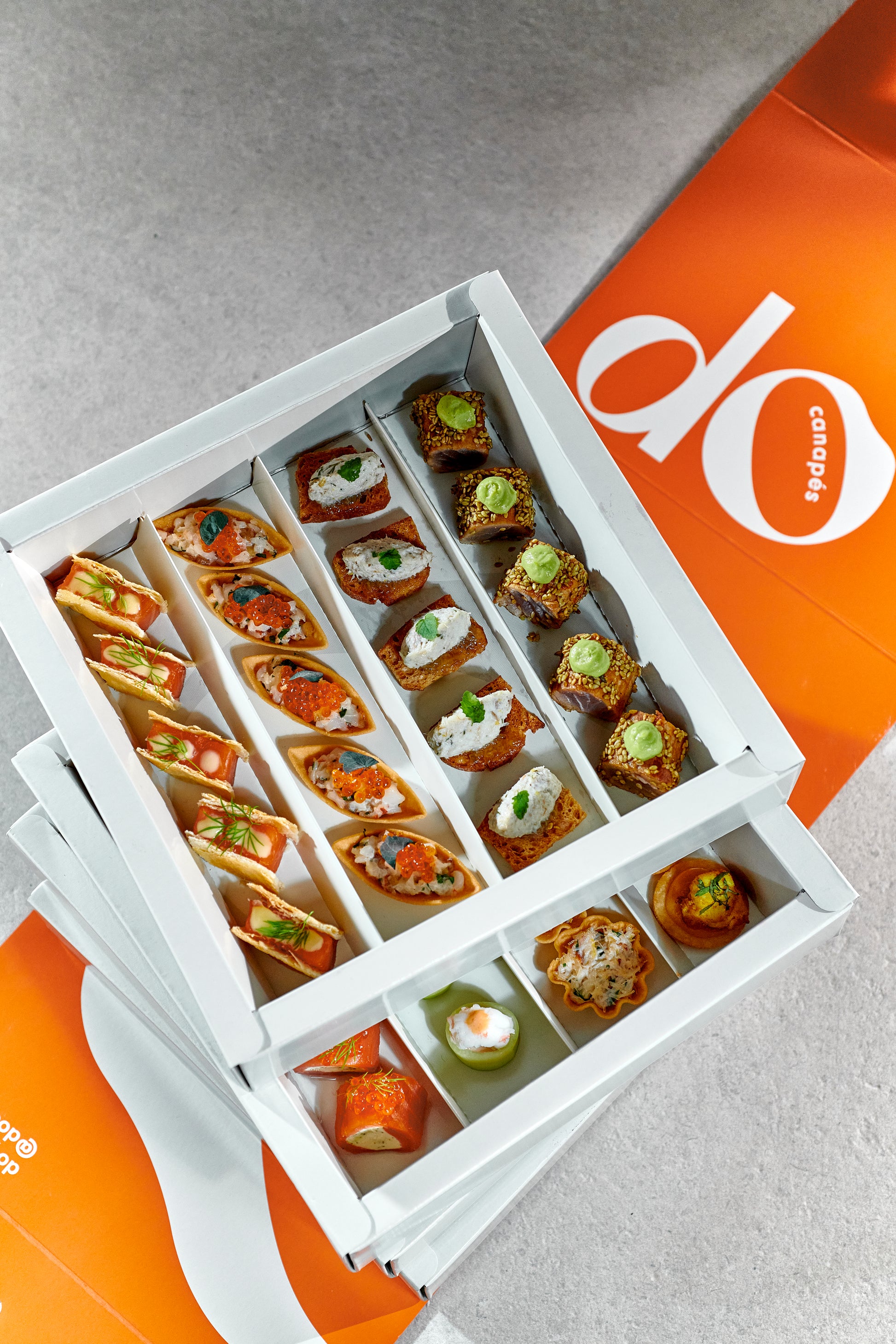 Each Do Canapés box is filled with a curated selection of bite-sized canapés, prepared fresh and beautifully arranged in our signature serve-straight-from-the-box tray. Each box serves approximately 12–16 people (or more for light snacking).