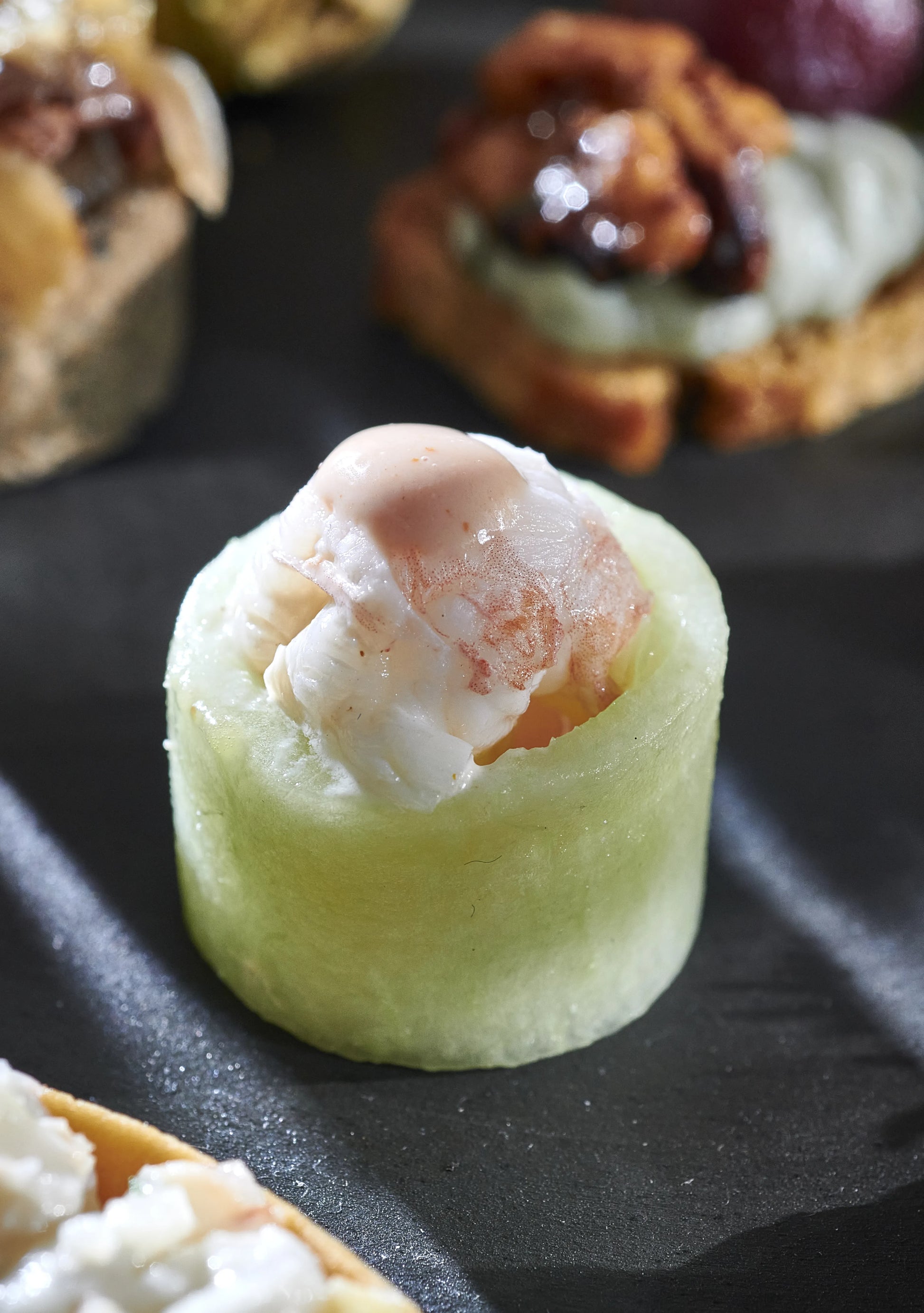 - Dublin Bay prawn cucumber cup, Marie Rose sauce, chive (CR,E,S)