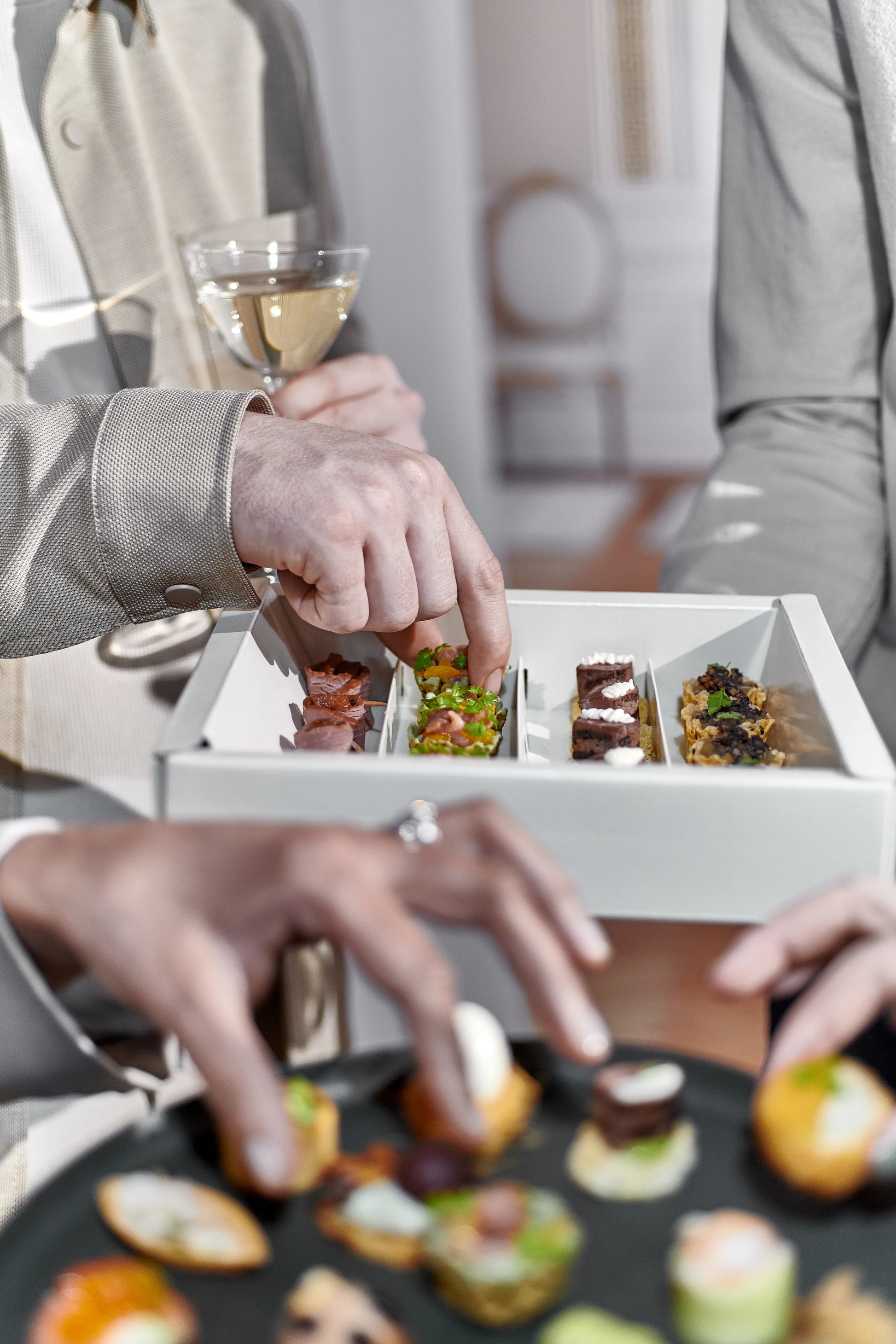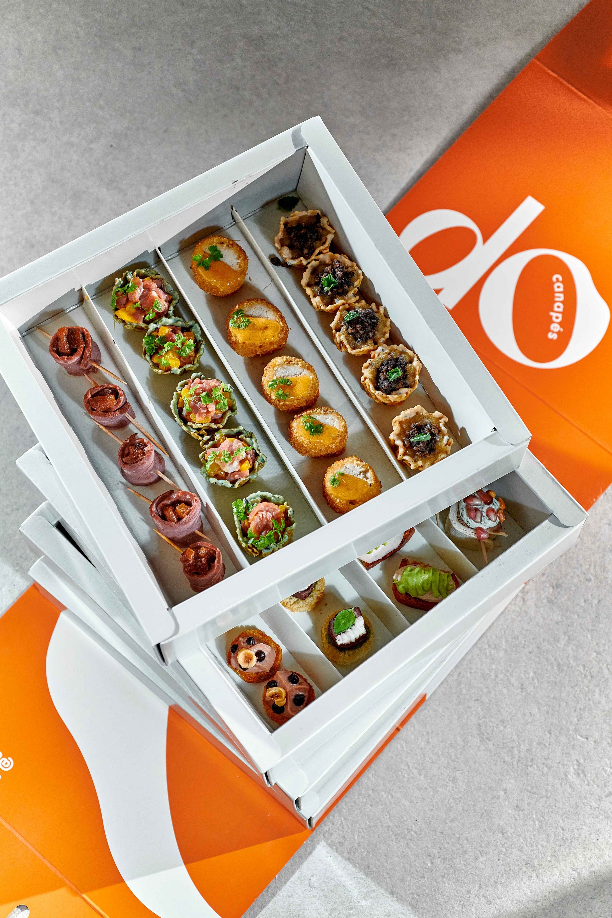Our minimum order is one box, which contains 80 canapés and serves 8-10 people as a substantial offering or up to 16 for lighter snacking.